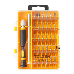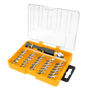 PUNTAS ATORNILLADOR 32P.• Contiene:• 1 mango de destornillador de precisión• 1 barra de extensión de 115 mm• 30 puntas CrV de 4×28 mm:SL: 1,0, 1,5, 2,0, 2,5, 3,0, 3,5, 4,0 mmPH: PH000, PH00, PH0, PH1PZ: PZ0, PZ1HEX : 0,7, 0,9, 1,3, 1,5, 2,0, 2,5, 3,0, 4,0 mmTX: T4, T5, T6, T7, T8, T9, T10, T15,…