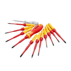 SET 13 DESTORNILLADORES CON AISLAMIENTO VDE• Aprobación VDE/GS• Hoja Cr-V con superficie acabada en negro• 4 piezas ranuradas: 1,2 × 6,5 x 100 mm, 1,0 × 5,5 x100 mm, 0,8 × 4,0 x 100 mm, 0,5 × 3,0 x 75 mm• 2 piezas Phillips: PH2 x 100 mm, PH1 x 80 mm• 2 piezas Pozidriv:…