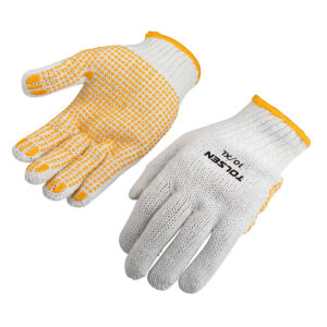GUANTE ALGODÓN/POLIE. PUNTOS PALMA 10(XL)• Peso: 700 g/doz• Material: poliéster y algodón, clase A• Puño tejido• Una docena en una bolsa de plástico conpegatina de colorSitio web: www.tolsen.com.uy