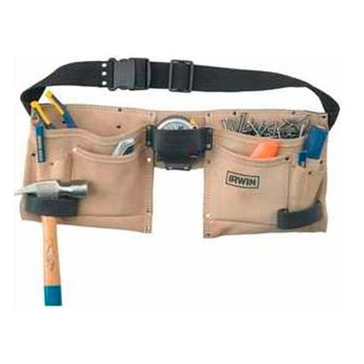 Cinturón para herramientas de uso general con 12 bolsillos. Hecho de gamuza genuina para mayor durabilidad, 2 soportes para martillo, cinta métrica y múltiples bolsillos para herramientas; Cinturón con cierre rápido.